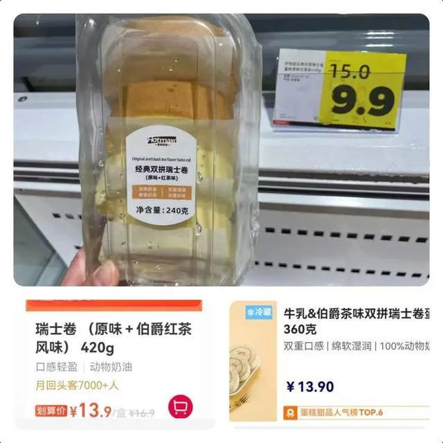但瑞士卷的价格则无优势。标注使用了动物奶油的原味+红茶味的双拼瑞士卷,240克卖9.9元;与盒马NB同口味双拼420克13.9元、奥乐齐360克13.9元相比,换算为同规格后还是后两者更划算。